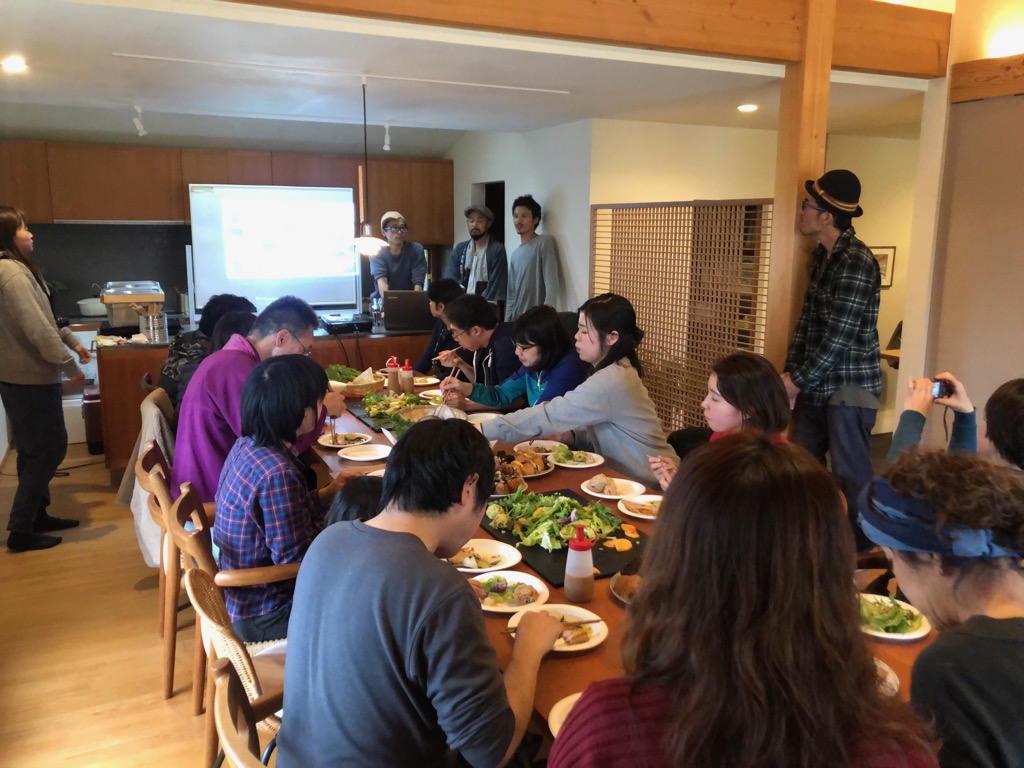 移住に興味をお持ちもバスツアーの方々にお食事をとっていただきながら、カネザワの家づくりや取組みをお話しました。